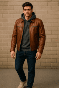 If you’re looking to add a little more flair, consider layering the jacket over a sweater or hoodie. The brown leather jacket with a hoodie combo is not only cozy but also gives off a street-style vibe. Throw on some sneakers or casual boots, and you’ve got yourself a go-to outfit that’s both functional and fashionable.